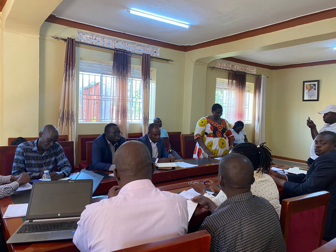 The state Minister representing persons with disabilities under Ministry of Gender Labour and Social Development,Hon. Asamo Hellen (PWD) interacting with the Senior Management Team of Budaka District Local Government.While in the meeting,a number of presentations were made in line with PDM, Roads, Health, Water and Land Management.She appreciated the pilot SACCO’s of Macholi and Sekulo upon receipt of the District PDM report.She explored the sites of Kamonkoli Seed School construction and urged the Contractor to speed up the works.She recommended that Budaka HCIV be upgraded to a hospital status for service delivery.The district stakeholders appreciated the minister’s visit since it was fruitful.