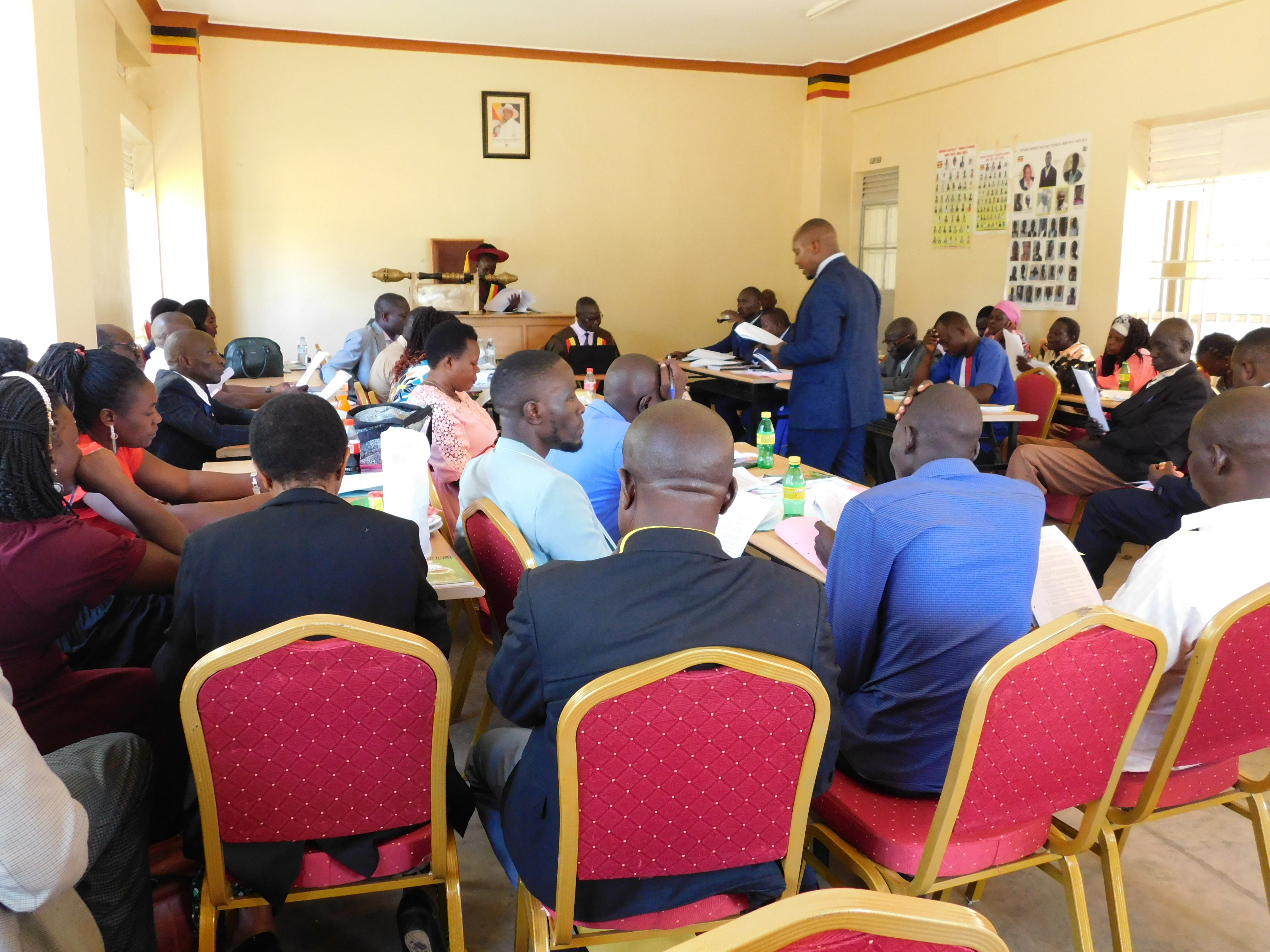District Chairperson Mr.Pajje Emmanuel ,presenting the State of the District Address for FY2023/2024 during the ongoing fourth council meeting today in the District Council Chambers.Mr.paajje Emmanuel reported on the state of the affair of the District,the budget performance for FY3023/2024,previous assessment results FY2022/23 where the district was ranked NO.48,internal LLG performance assessment exercise and Locally Raised Revenue of the district amounting to Ugx 375,343,000 as approved by council. Among the other key items in the Order of Business included;approval of the supplementary budget and approval of Kamonkoli Town Council Area Land Committee members respectively.