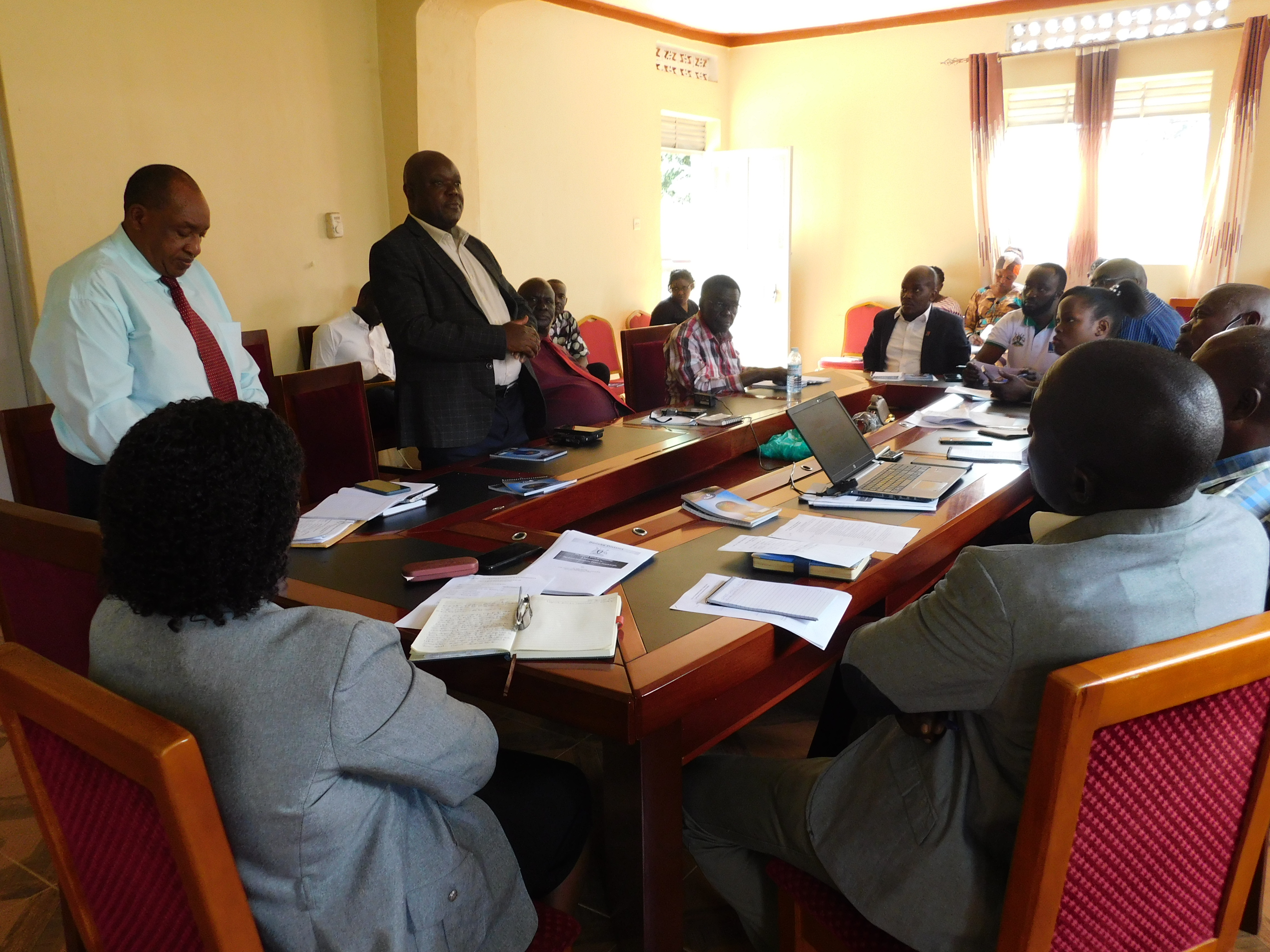 District Executive committee members, Heads of Departments and sector heads in a meeting today with the team from the Local Government Finance Commission (LGFC) at the district boardroom.According to Mr. Gumirisiza Johnson, the Principal Financial Analyst who doubles as the Head of Grant Advisory services Department under the LGFC, he informed the meeting that the Commission under Article 194 of the Constitution is mandated to render advice to government on all matters of financing.He further explained to members that the meeting is aimed at gathering information on financing in order to offer credible advise to government for improved service delivery.He added that their focus was on understanding issues on utilization of the funds and how the programs under unconditional grant are being implemented.He then tasked the Departments of Works, Community, Internal Audit and Natural Resource to come with their work plans of the amount of resources they need to deliver service to the population.Mr.Magoola Balamu,the Chief Finance Officer informed members that the district is financed through Locally Raised Revenue, Central Government transfers and other external /donor financing.He further explained that the resource envelop was still small to be shared by the different departments since LLR for FY2023/24 was Ugx375,343,000,DDEG Ugx622,237,000 and District Unconditional Grant Ugx 658,533,000. He appealed to Local Government Finance Commission to increase on the resource envelope for service delivery.Ms.Jane Akiror appreciated the team from LGFC for the dialogue with the stakeholders on matters relating to finance.She then encouraged the departments of Works, Community, Internal Audit and Natural Resource to share their work plans with the Principal Finance Analyst immediately as requested.